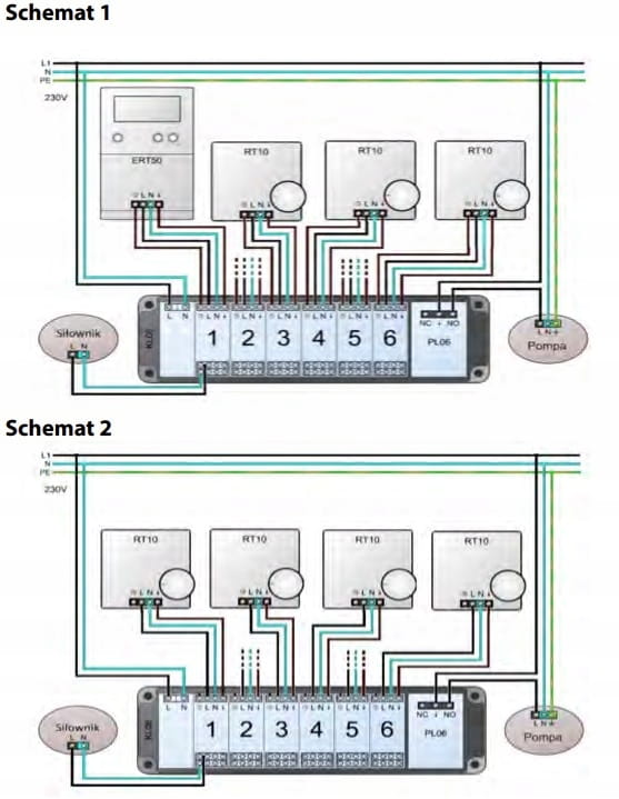 SALUS RT10 oferuje możliwość dostosowania temperatury w zależności od pory dnia, co umożliwia efektywne zarządzanie systemem grzewczym. Funkcja obniżania temperatury pozwala na jej zmniejszenie o 4ºC bez konieczności regulacji termostatu, co nazywane jest "nocnym obniżeniem temperatury". Funkcja NSB w regulatorze SALUS RT10 jest aktywowana przez zewnętrzny sygnał wysyłany przez listwę Salus model KL06. Sygnał do listwy jest przekazywany przez tygodniowy regulator firmy Salus model ERT50. Regulator RT10 musi być podłączony do listwy KL06 za pomocą 4-żyłowego kabla zgodnie ze schematem numer 1. Jeśli nie podłączymy pola oznaczonego zegarem, funkcja NSB nie będzie aktywna, ale pozostałe funkcje regulatora będą działać prawidłowo.