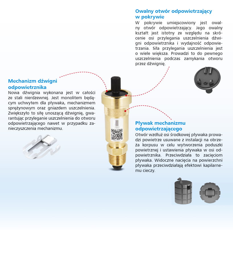 Sercem nowej generacji odpowietrznika jest pływak, który dzięki płynnej i precyzyjnej pracy wewnątrz korpusu urządzenia reaguje natychmiast i usuwa najmniejsze ilości powietrza z wnętrza odpowietrznika.