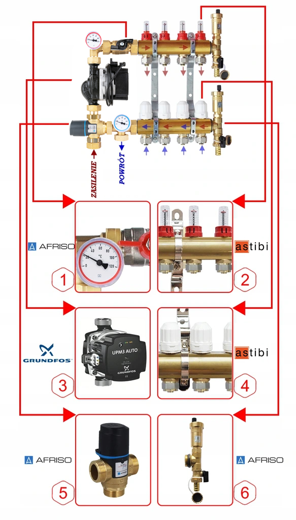 Rozdzielacz 11 obwody do podłogówki BTU 501 AFRISO, pompa Grundfos
