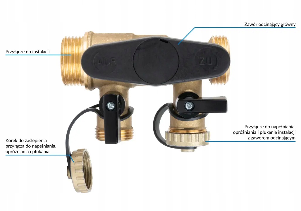 Umożliwia napełnienie, opróżnienie oraz wypłukanie/odpowietrzanie instalacji po podłączeniu do sieci wodociągowej lub stacji napełniającej