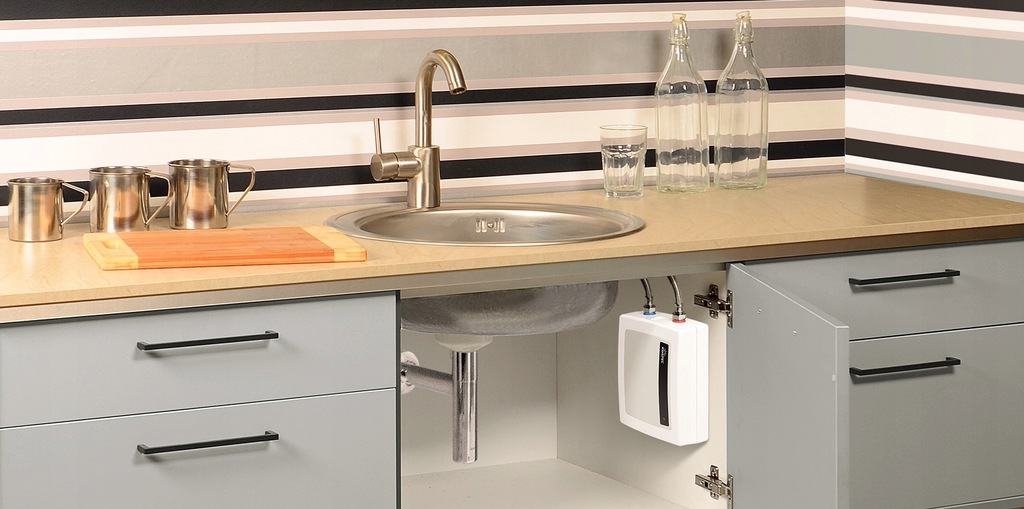 Elektryczny podgrzewacz idealny do umywalki lub zlewozmywaka z możliwością montażu w pozycji z króćcami w górę, lub w dół, nad lub pod umywalką.