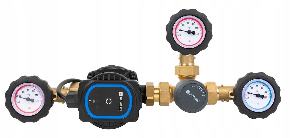 Grupy składają się z trzech zaworów odcinających ze zintegrowanymi termometrami, pompy obiegowej i zaworu mieszającego. Zawór odcinający z niebieskim termometrem wyposażono w zawór zwrotny.