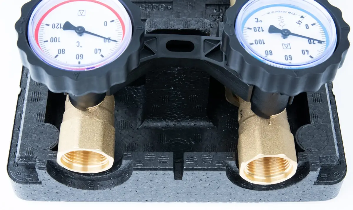 - dwa termometry do pomiaru temperatury na zasilaniu i powrocie, wbudowane w pokrętło zaworów odcinających,