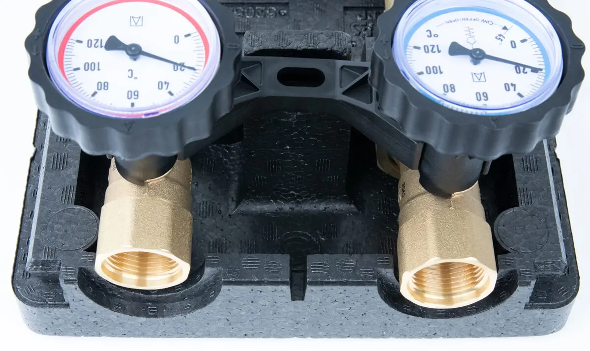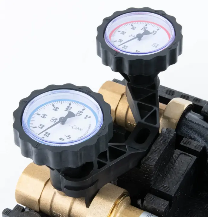 • dwa termometry do pomiaru temperatury na zasilaniu i powrocie, wbudowane w pokrętło zaworów odcinających,