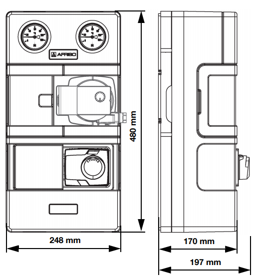- Zainstalowany zawór mieszający ARV KvsVario - wartość współczynnika Kvs może być ustawiana na 12, 16 lub 22 m3/h oraz siłownik ARM 343 ProClick (3-pkt., 230 V, 120 s).