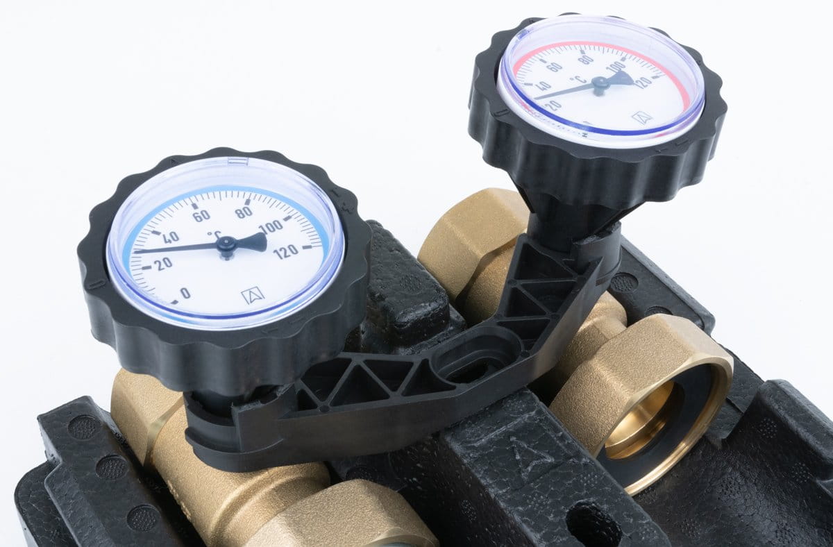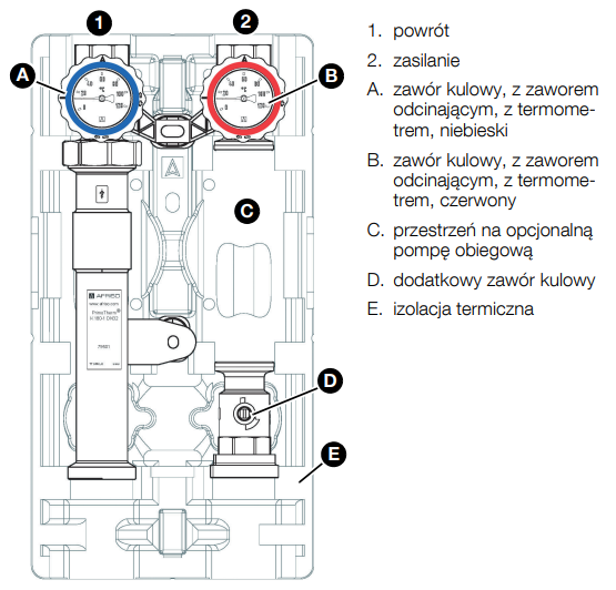 - Wyposażona w niezbędne komponenty: termometry do pomiaru temperatury zasilania i powrotu, zawór zwrotny, zawory odcinające na zasilaniu i powrocie, zawór odcinający przed pompą, izolacja termiczna.