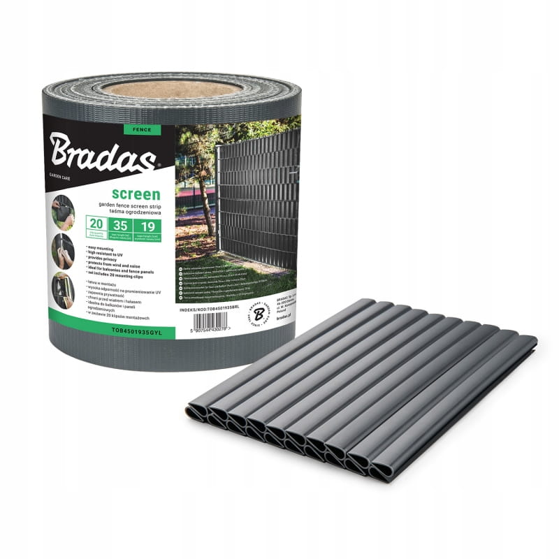Taśma ogrodzeniowa 19cm x 35m - 1 szt./folia termokurczliwa 450g/m2 BRADAS GRAFITOWA / CIEMNO SZARA ( w komplecie klipsy mocujące )
