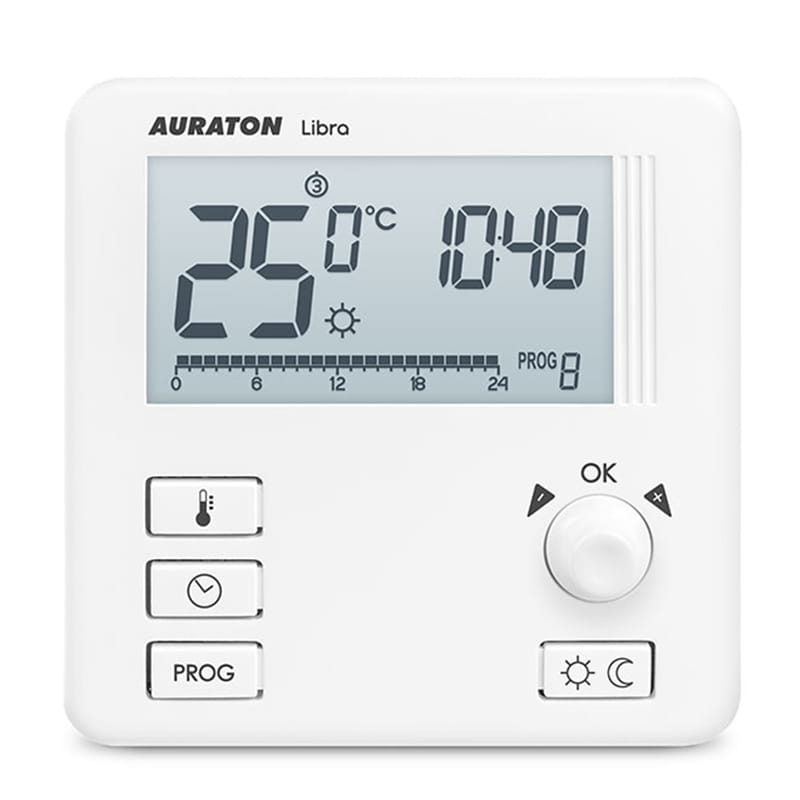 AURATON Libra to przewodowy, elektroniczny regulator pozwalający na tygodniowe programowanie temperatury. Regulator AURATON Libra umożliwia użytkownikowi zarządzanie siedmioma niezależnie konfigurowanymi programami, jak również posiada fabrycznie ustawioną temperaturę przeciwzamrożeniową. Dodatkowo posiada tryb ręczny oraz urlopowy. Minimalna ilość przycisków pozwala na sprawną i szybką obsługę. Regulator wyposażony jest w tryb pracy PWM, polegający na cyklicznym załączaniu i wyłączaniu urządzenia grzewczego minimalizując wahania temperatur. Algorytm PWM utrzymuje komfort cieplny w pomieszczeniu wyprzedzając zachowania układu grzewczego, jednocześnie dbając o niższe zużycie energii. Istotną innowacją w AURATON Libra jest możliwość ustawienia termostatu w tryb chłodzenia tak ważny w coraz cieplejsze pory letnie.