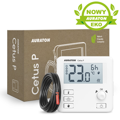 AURATON Cetus P to przewodowy regulator temperatury pracujący w cyklu 24 godzinnym. Umożliwia ustawienie temperatury z dokładnością do 0,2°C. Posiada funkcję tymczasowego obniżenia temperatury nawet o 5°C na 12 godzin, podczas gdy domownicy nie przebywają w miejscu zamieszkania.