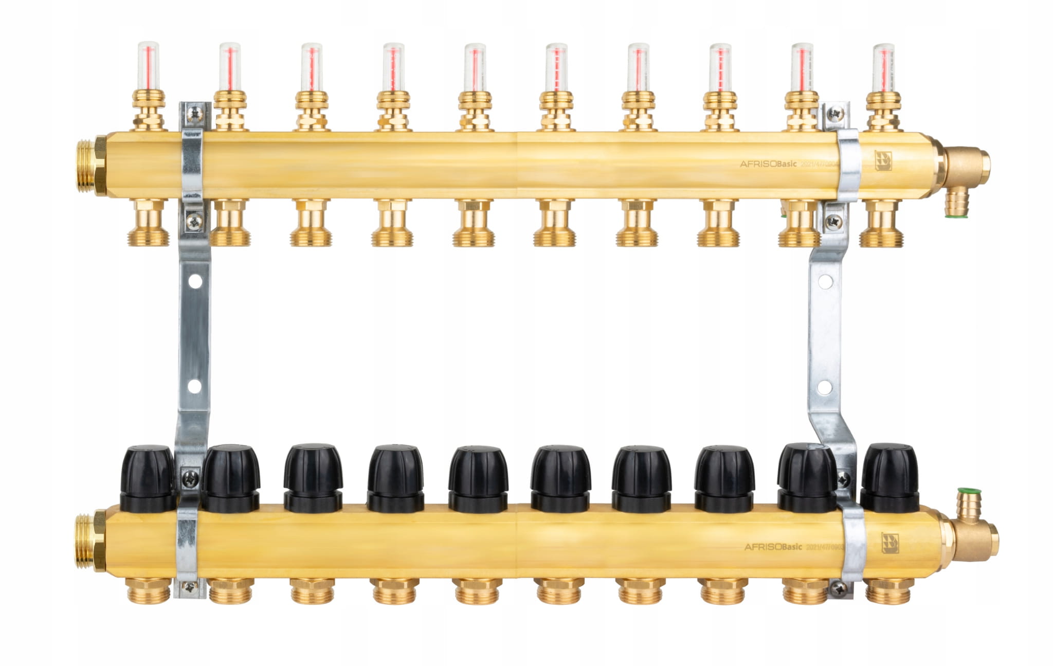 Oferujemy rozdzielacz mosiężny na 10 obiegów AFRISO, idealny do dystrybucji czynnika grzewczego w instalacjach podłogowych. Dzięki wbudowanym rotametrom i zaworom termostatycznym, możesz łatwo regulować przepływ na każdym obiegu.