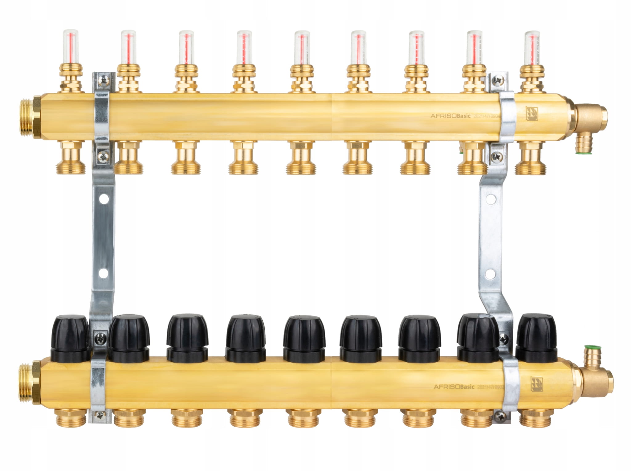 Rozdzielacz mosiężny na 9 obiegów AFRISO to doskonałe rozwiązanie do dystrybucji czynnika grzewczego w instalacjach podłogowych. Dzięki wbudowanym rotametrom i zaworom termostatycznym, możesz precyzyjnie regulować przepływ na każdym obiegu.
