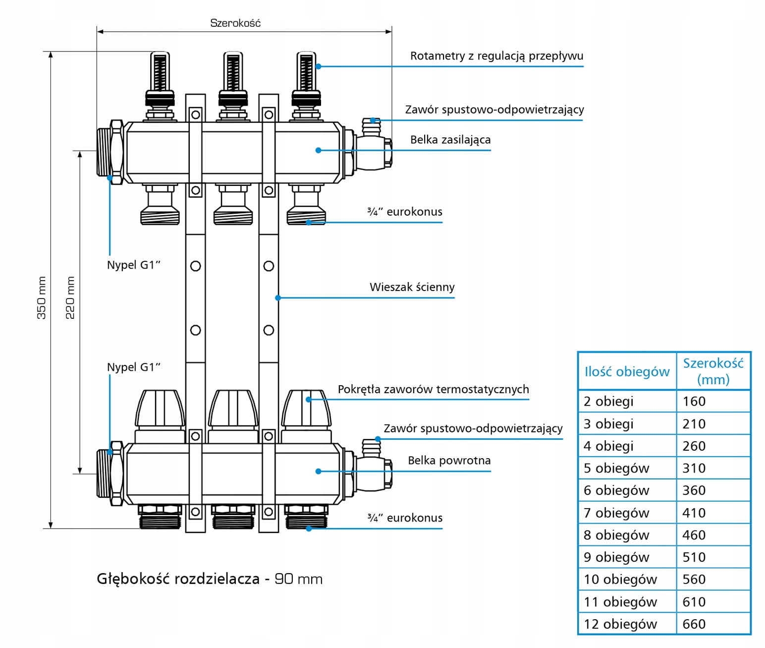 Rotametry wskazują przepływ przez każdą pętlę, a regulację przepływu wykonuje się za pomocą dolnego elementu radełkowanego. Dodatkowo, dzięki zaworom spustowo-odpowietrzającym na końcu belek rozdzielacza, możesz łatwo napełniać instalację, spuszczać medium i odpowietrzać ją. Ten rozdzielacz mosiężny na 9 obiegów ma solidne parametry techniczne. Może pracować przy maksymalnym ciśnieniu 5 barów i temperaturze do 70°C. Przyłącza główne mają gwint G1", a przyłącza obiegów to ¾" eurokonus. Przyłącza zaworów termostatycznych mają gwint M30 x 1,5. Zakres rotametrów wynosi od 0,5 do 3,5 l/min. Wykonany jest z mosiądzu CW617N, a maksymalne stężenie glikolu, jakie może obsłużyć, to 50%.