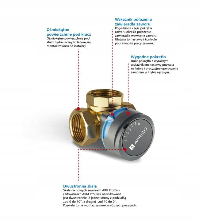Pokrętło i niebieski pierścień ograniczający, zamontowane są na zaworze na zatrzask. Pod pokrętłem zawsze znajduje się przykręcony adapter do siłowników elektrycznych ARM ProClick. Montaż siłownika odbywa się poprzez nasunięcie go na zawór z adapterem w dogodnej dla użytkownika pozycji. Aby zsunąć siłownik z zaworu wystarczy tylko nacisnąć i przytrzymać przycisk zwalniający mechanizm blokujący.