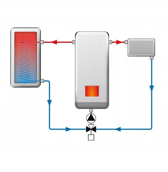 Zawór 3-drogowy przełączający AZV może być sterowany regulatorem lub termostatem, którego czujnik umieszczony będzie w zasobniku. W pierwszym wypadku zawór AZV będzie się przełączał na obieg grzejnikowy lub podgrzewanie wody w zasobniku w zależności do wybranego priorytetu na regulatorze. W drugim może podgrzewać zasobnik jeśli temperatura wody w nim zgromadzonej spadnie poniżej tej ustawionej na termostacie.