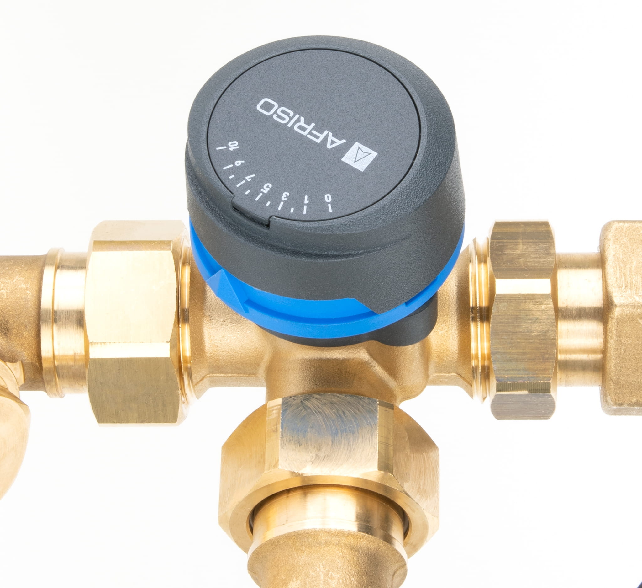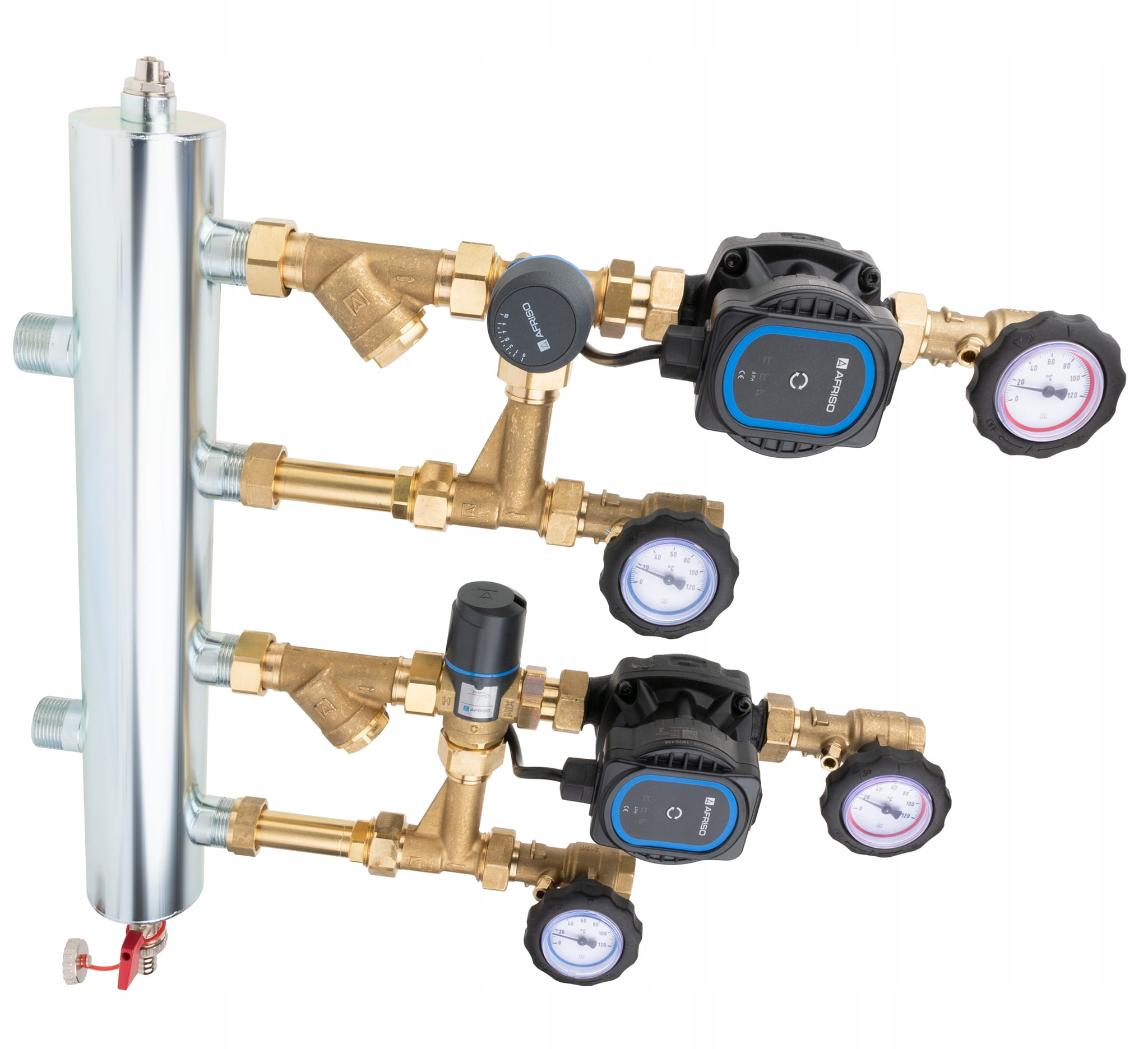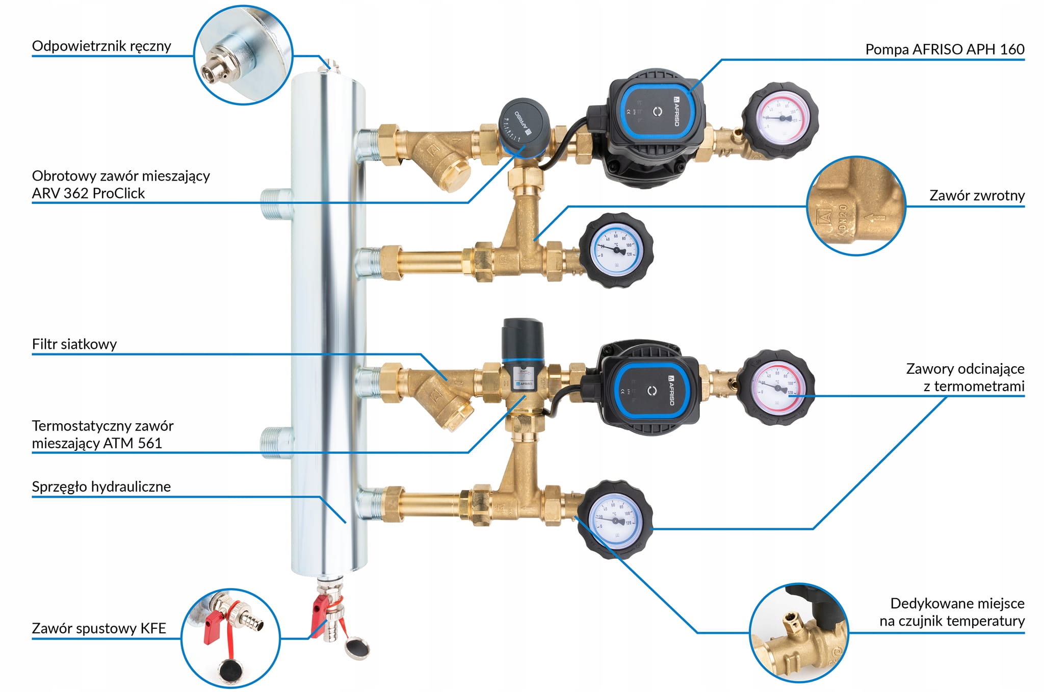 Zestaw Afriso: sprzęgło hydrauliczne BPS 961 AP, dwa człony z zaworem obrotowym ARV 362 i termostatycznym ATM 561, pompy AFRISO APH 160