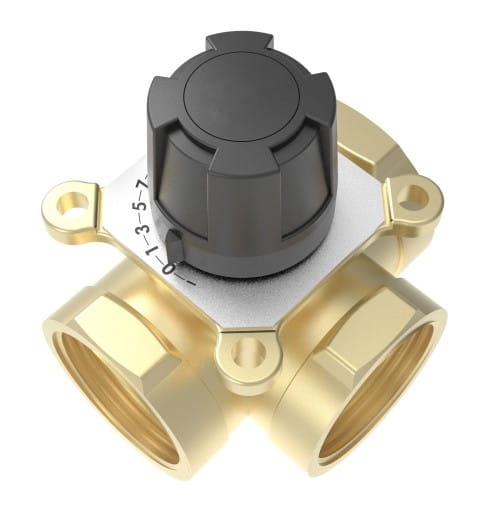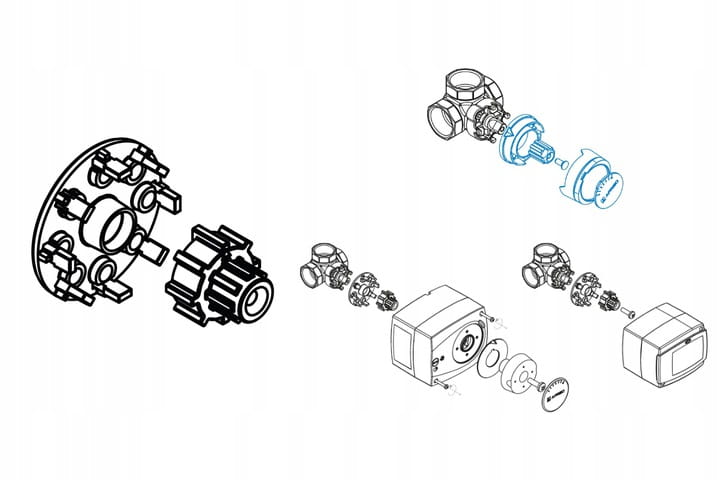 Zestawy regulacyjne składają się z mosiężnego 3-drogowego obrotowego zaworu mieszającego, zestawu montażowego oraz siłownika elektrycznego ARM 141 (230 V AC, 3-punktowy, czas obrotu 120 s, moment obrotowy 6 Nm).