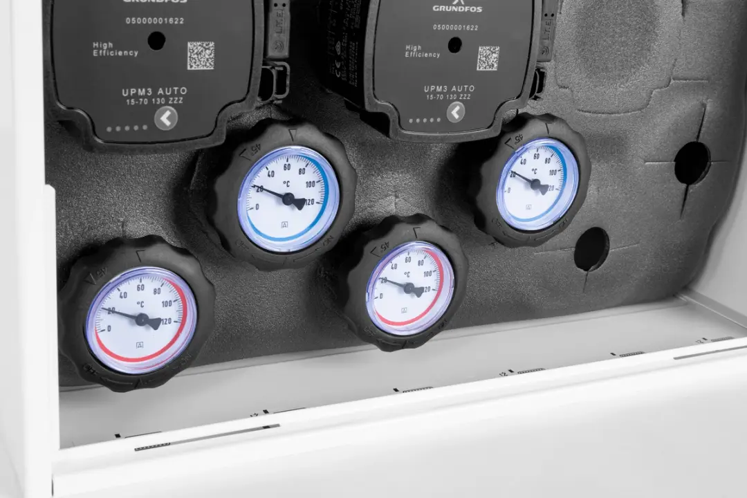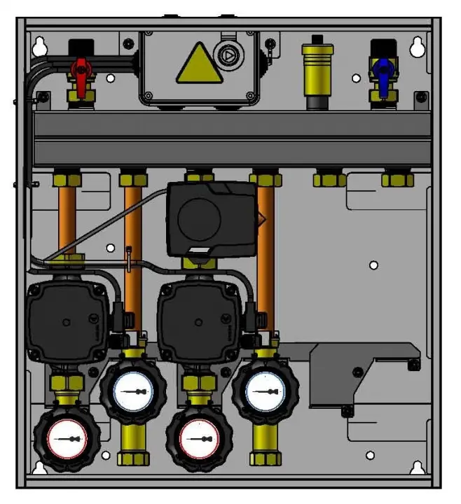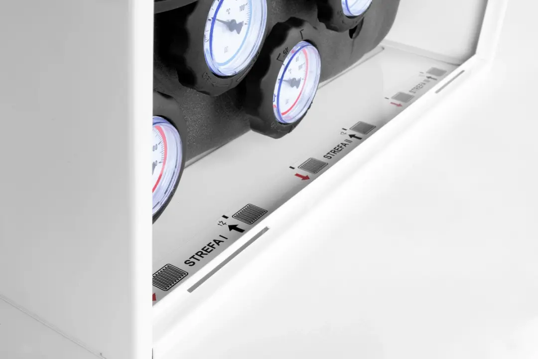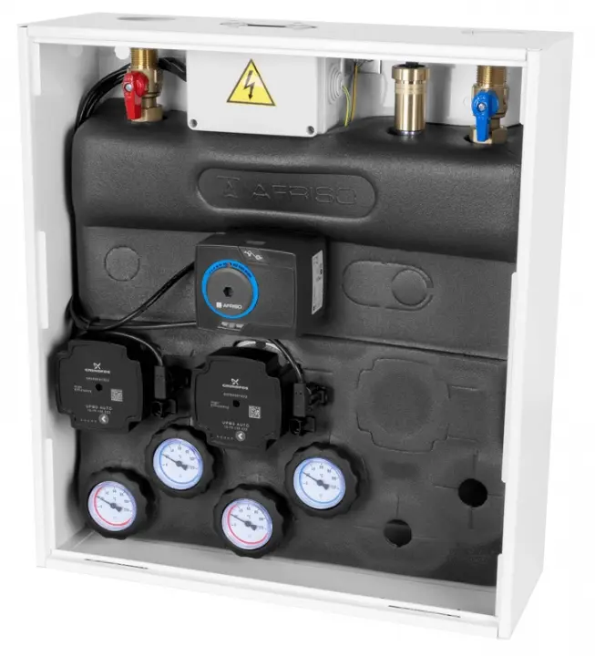 Zestawy mieszające PrimoBox AZB to kompaktowe prefabrykowane rozwiązanie, rozdzielające medium grzewcze na poszczególne obiegi. W metalowej szafce zestawu znajdziemy między innymi: