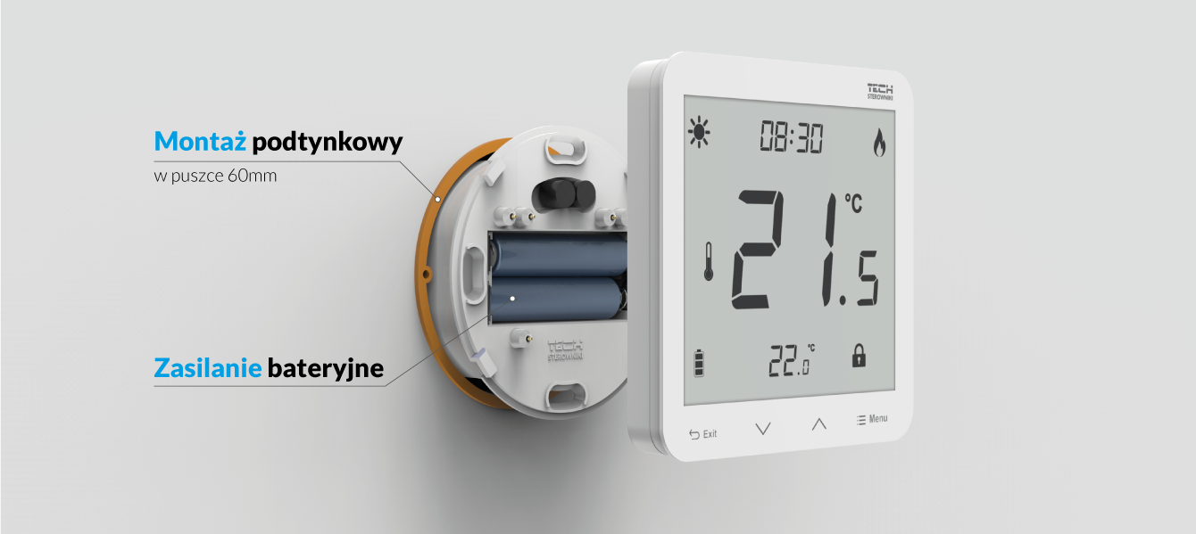 - Zakres nastaw temperatury pokojowej: Baterie 2xAAA 1,5V lub 230V