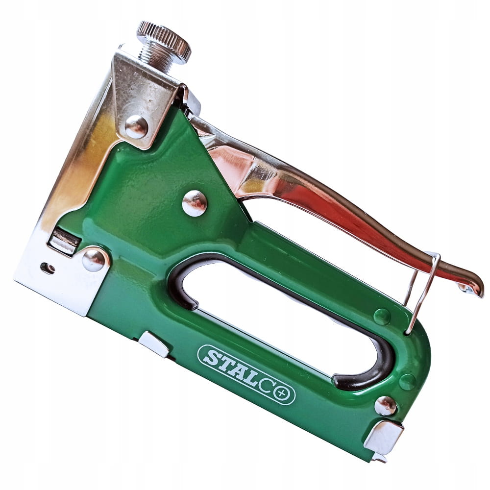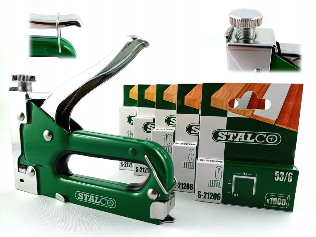 Taker tapicerski STALCO 4-14mm w zestawie z zszywkami wzmacnianymi 8mm. Uniwersalne zastosowanie w wielu dziedzinach takich jak: oprawianie zdjęć i obrazów, tapicerka, mocowanie folii zabezpieczającej lub izolacyjnej, plakatów, ogłoszeń czy reklam. Wyposażony jest w pokrętło regulacji siły wbijania, co pozwala na lepszą kontrole głębokości mocowanych materiałów, bez obawy o uszkodzenie delikatnych tworzyw. Jest kompatybilny z zszywkami typ 53/530/A 4-14 mm. Dzięki wytrzymałej stalowej konstrukcji pozwala na długotrwałą pracę bez obaw o uszkodzenie. Wygodna, wyprofilowana rączka doskonale dopasowuje się do nadgarstka.