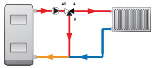 Zawór ATV stosowany w funkcji rozdziału strumienia medium pomiędzy zasilaniem instalacji grzewczej, a bezpośrednim powrotem do kotła przez bajpas. Aplikacja taka umożliwia wygrzanie się kotła do określonej temperatury podczas jego rozruchu.