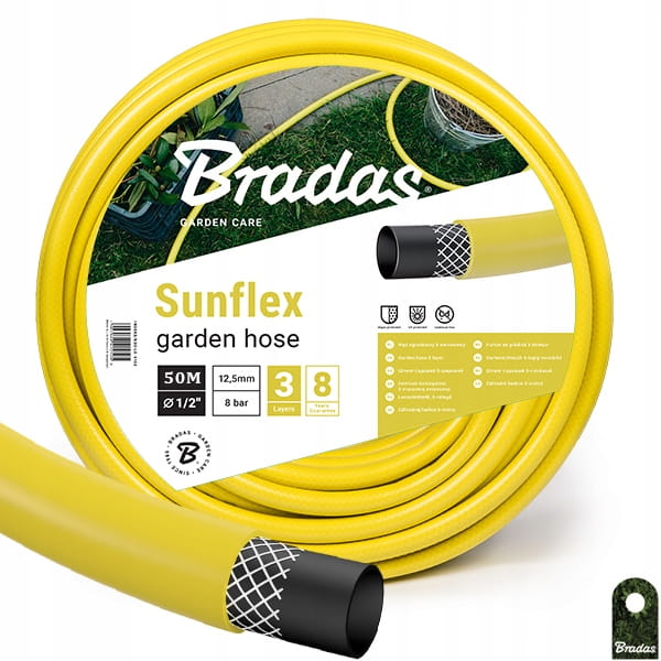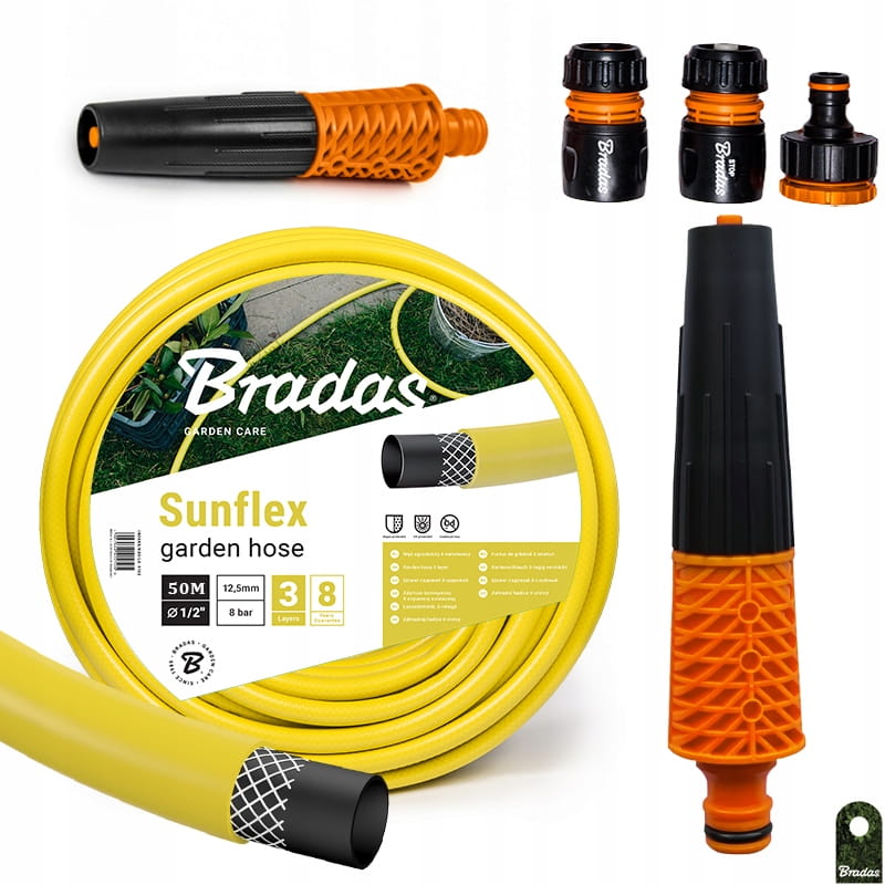 Zestaw ogrodowy SUNFLEX marki Bradas to m.in. zbrojony wąż, który przyda się do wielu prac w ogrodzie, takich jak nawadnianie roślin, ale również do prac porządkowych, na przykład do mycia samochodu, roweru czy meble ogrodowych. Prezentowany wąż ma długość 50 m i wykonany jest z miękkiego PCV pozbawionego szkodliwego kadmu, dzięki czemu nadaje się do kontaktu z roślinami. Wąż jest wygodny w codziennym użytkowaniu, jest odporny na zginanie, splatanie i powstawanie słupów wody. W skład zestawu wchodzą: