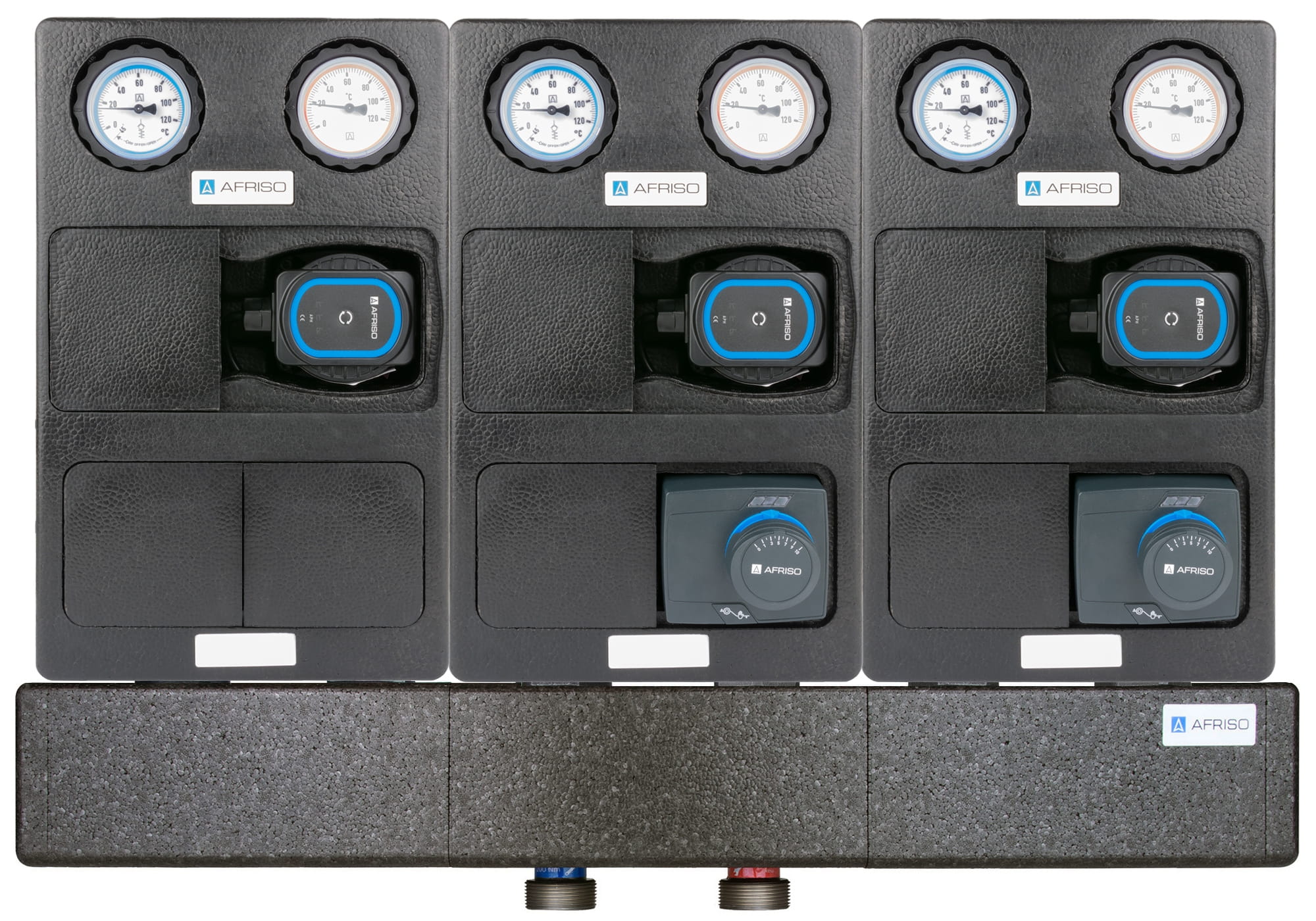 Zestaw grup pompowych PrimoTherm K 180-2 AFRISO z rozdzielaczem, 3 pompami APH AFRISO i 2 siłownikami ARM 343 AFRISO - 3 obiegi