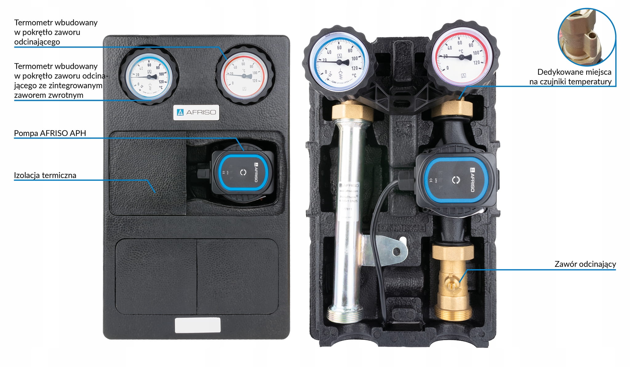 W skład grupy pompowej AFRISO PrimoTherm K 180-2 DN25 z pompą APH AFRISO wchodzi: