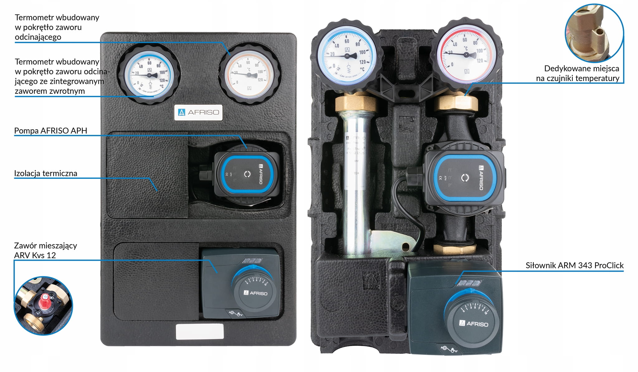 W skład grupy pompowej AFRISO PrimoTherm K 180-2 DN25 z pompą APH AFRISO, zaworem mieszającym ARV AFRISO i siłownikiem elektrycznym ARM 343 ProClick wchodzą: