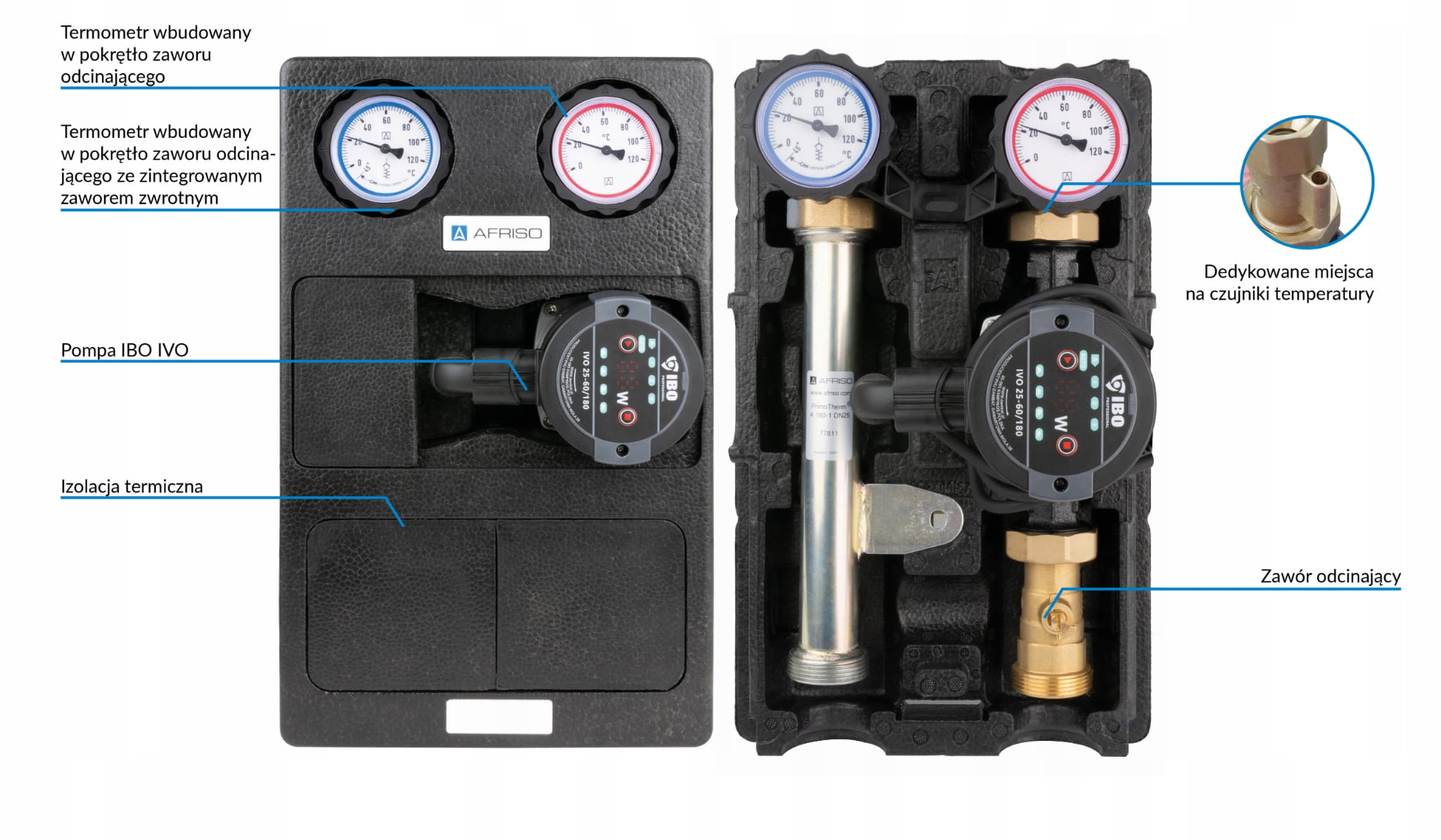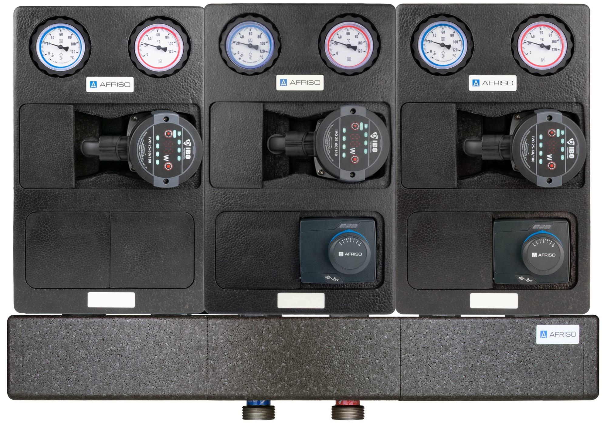 Zestaw PrimoTherm AFRISO jest wyposażony w 3 energooszczędne pompy elektroniczne IBO IVO 25-60/180, które charakteryzują się bardzo niskim zużyciem energii, nawet do 5W. Całość znajduje się w estetycznej izolacji termicznej, a dzięki modułowej budowie możliwa jest zamiana stronami zasilania i powrotu.