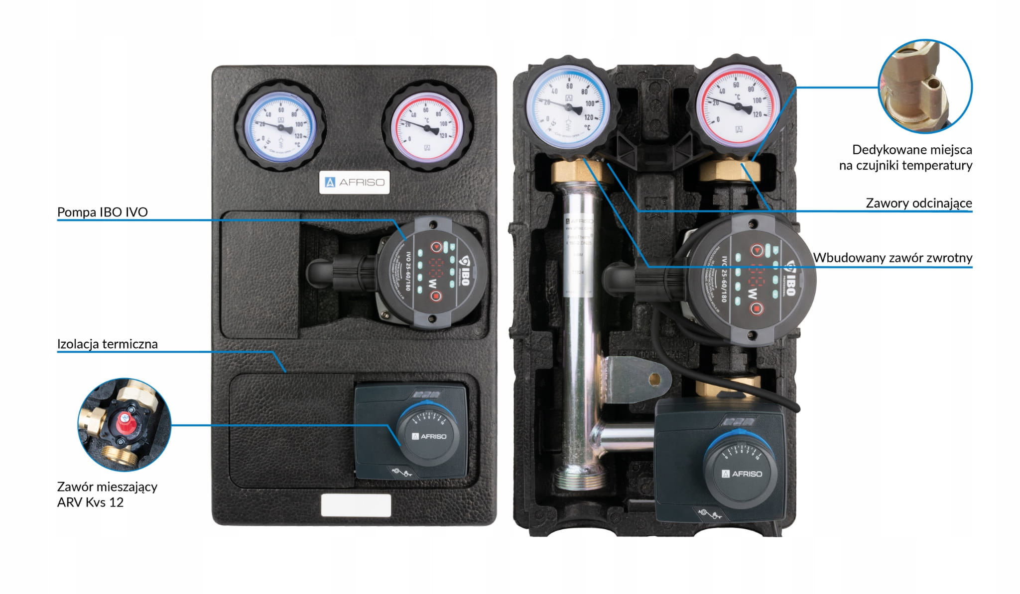 - Termometry do pomiaru temperatury na zasilaniu i powrocie, wbudowane w pokrętło zaworów odcinających