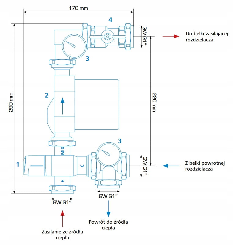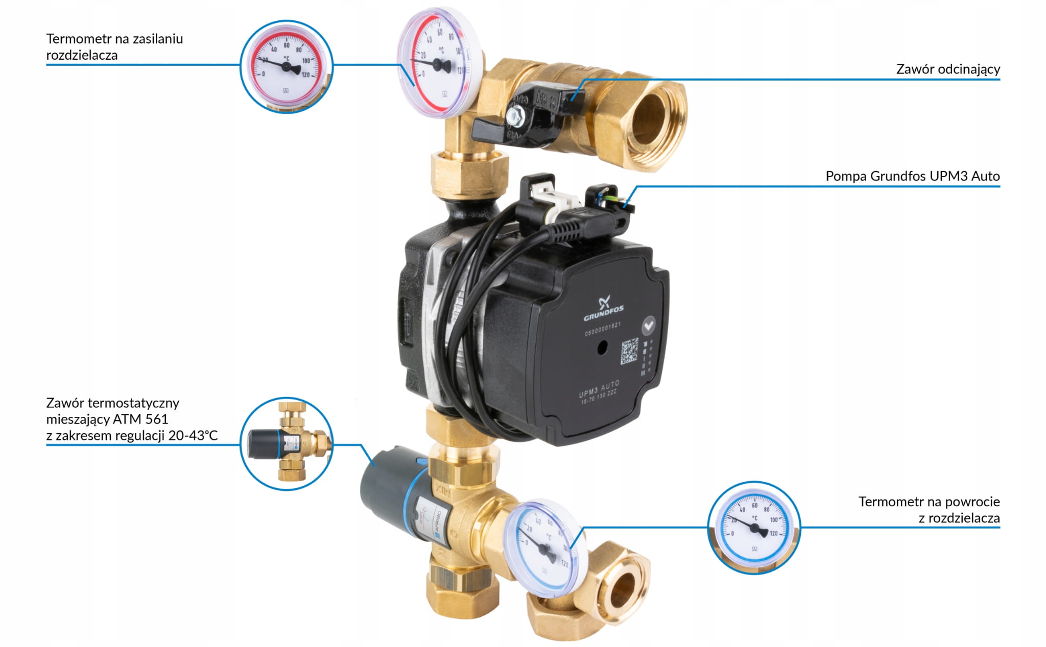 Wyposażony w termostatyczny zawór mieszający ATM 561, który utrzymuje temperaturę zasilania w zakresie 20-43°C. Pompa obiegowa Grundfos UMP3 Auto zapewnia efektywną pracę. Termometry na zasilaniu i powrocie z rozdzielacza kontrolują temperaturę medium. Zawór odcinający umożliwia odcięcie pompy obiegowej od belki zasilającej rozdzielacza.