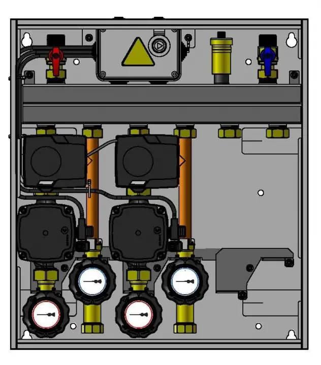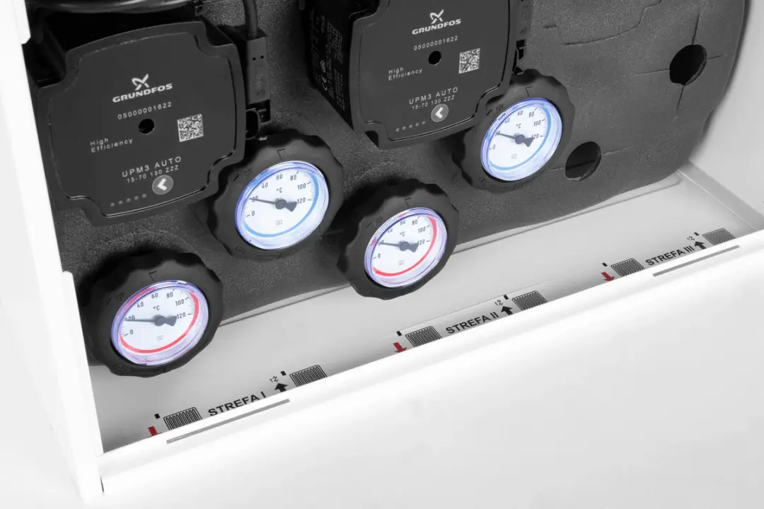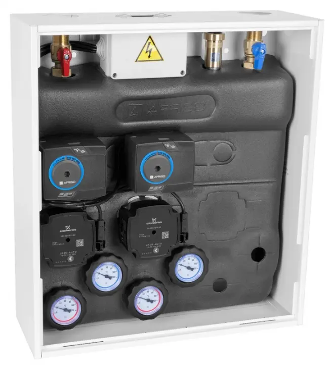 Zestawy mieszające PrimoBox AZB to kompaktowe prefabrykowane rozwiązanie, rozdzielające medium grzewcze na poszczególne obiegi. W metalowej szafce zestawu znajdziemy między innymi:
