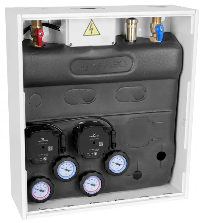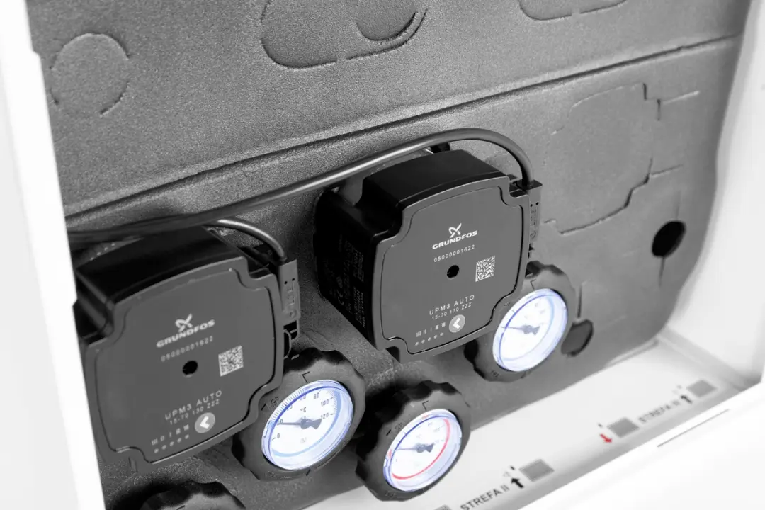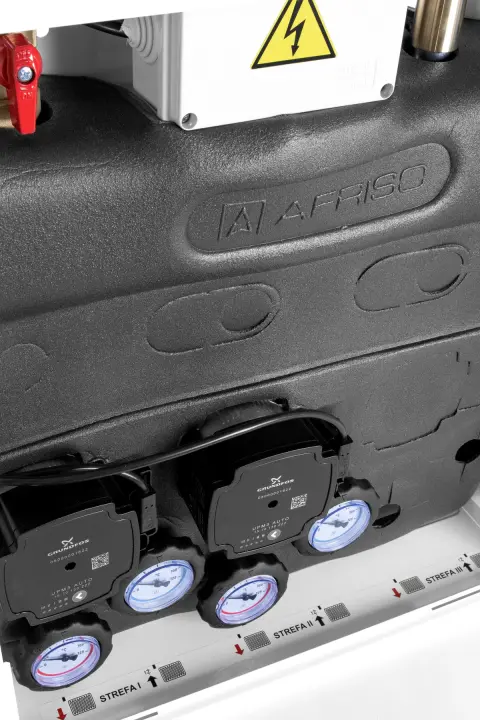 Zestawy mieszające PrimoBox AZB 200 to kompaktowe prefabrykowane rozwiązanie, rozdzielające medium grzewcze na poszczególne obiegi. W metalowej szafce zestawu znajdziemy między innymi: