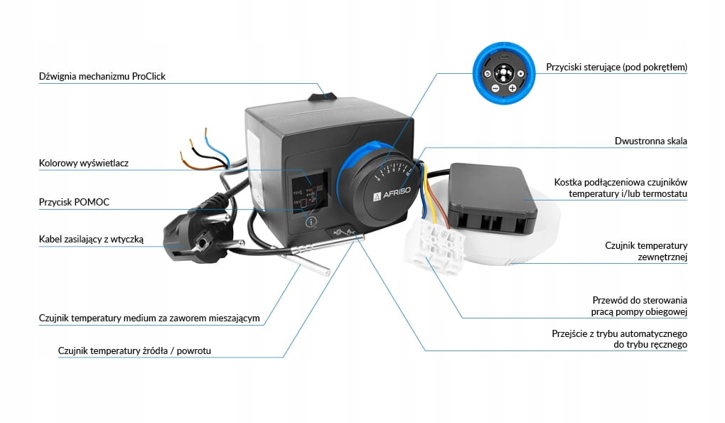- Czujnik temperatury medium za zaworem mieszającym (1 m).